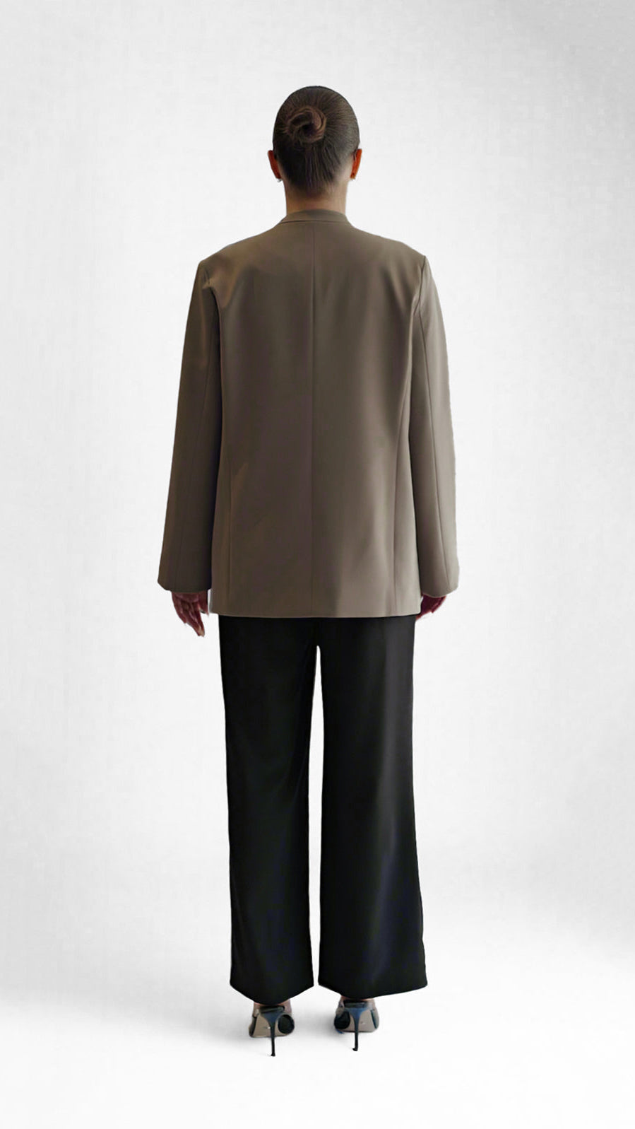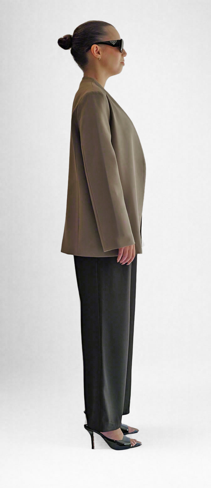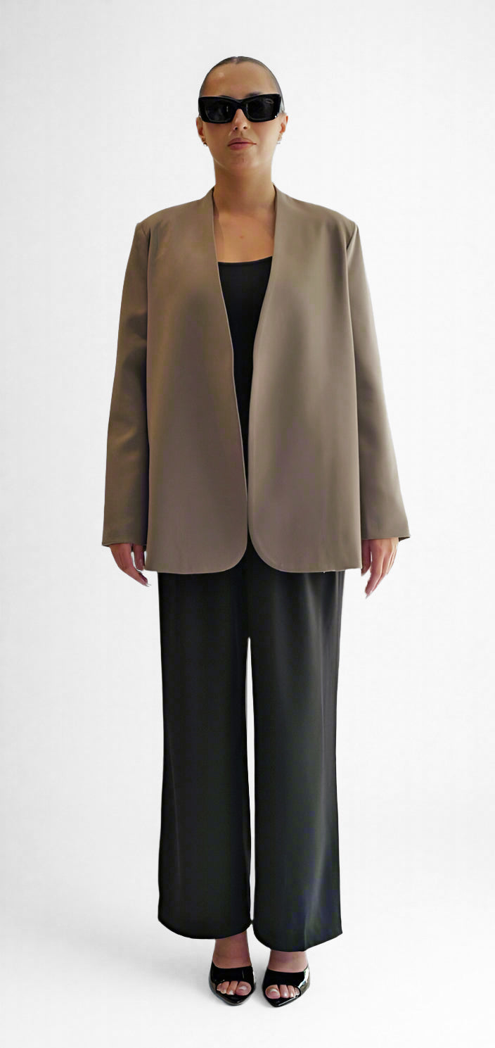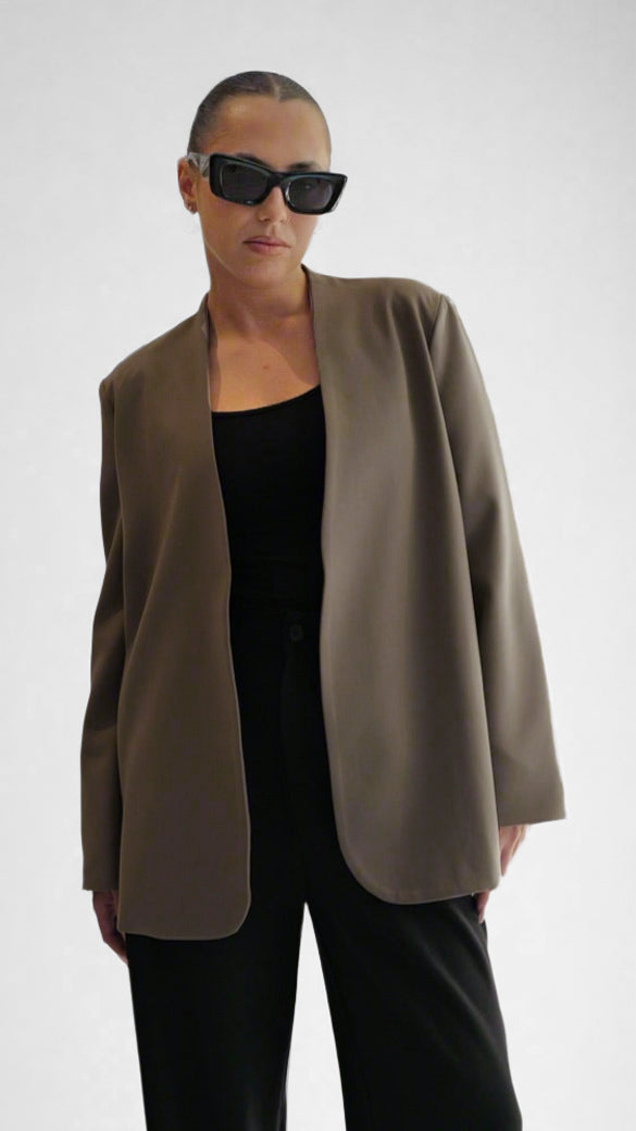 This taupe blazer features a collarless, open-front design with softly curved hems for a sleek silhouette. Crafted for versatility, it’s perfect layered over tanks or knits for an effortlessly polished look—ideal for workdays or casual outings alike.