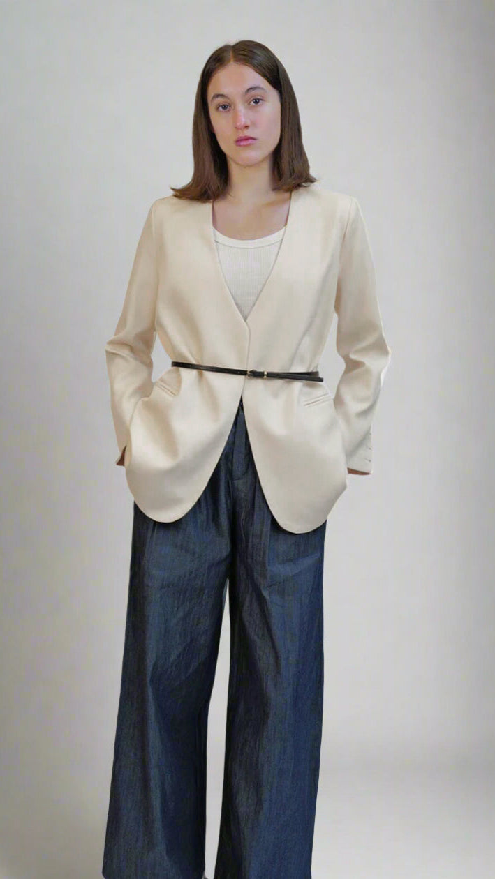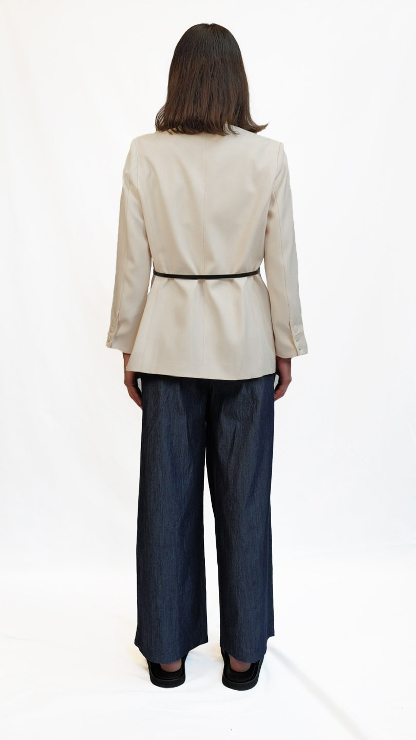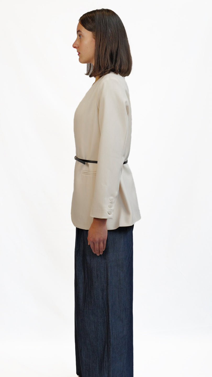 Refined and minimalist, this blazer features a clean neckline, soft structure, and a subtle cinch at the waist with a slim belt. Tailored for versatility, it can be styled open or belted for a more defined silhouette. Comes in camel brown and off-white colour.