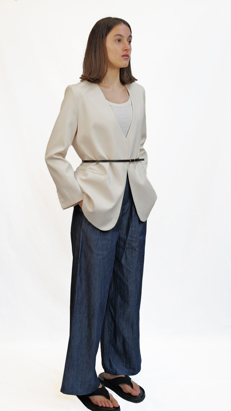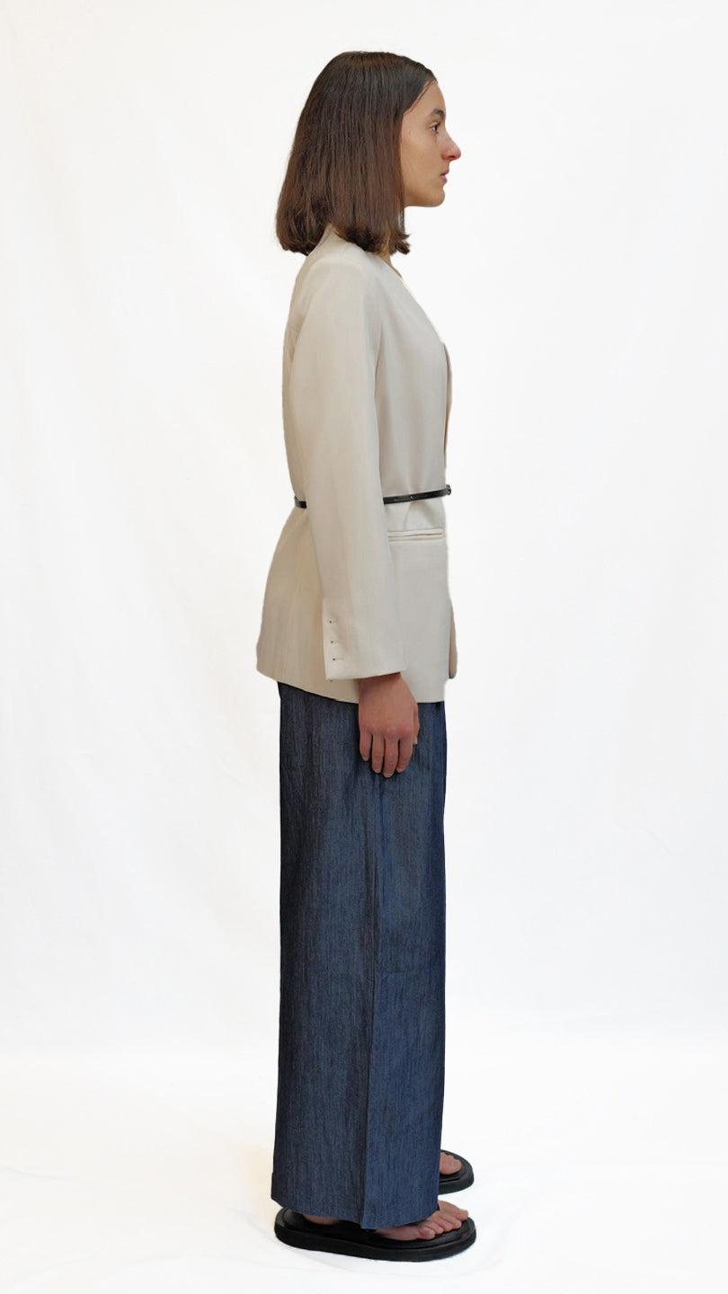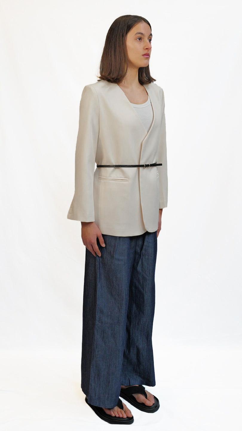 Refined and minimalist, this blazer features a clean neckline, soft structure, and a subtle cinch at the waist with a slim belt. Tailored for versatility, it can be styled open or belted for a more defined silhouette. Comes in camel brown and off-white colour.
