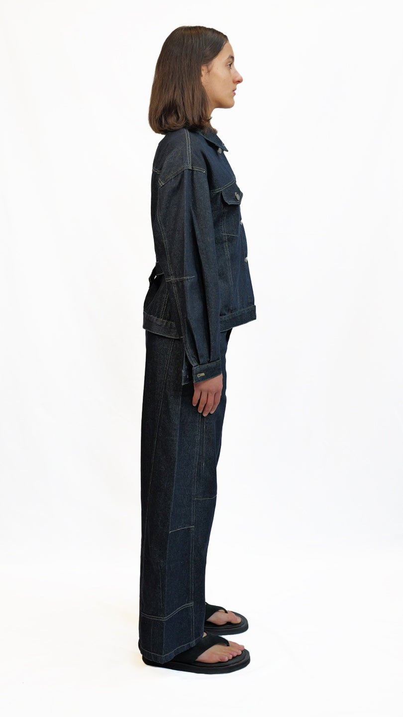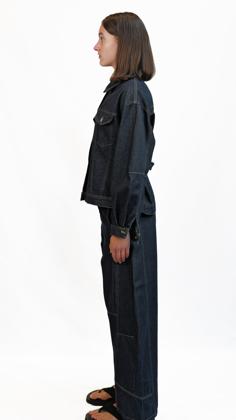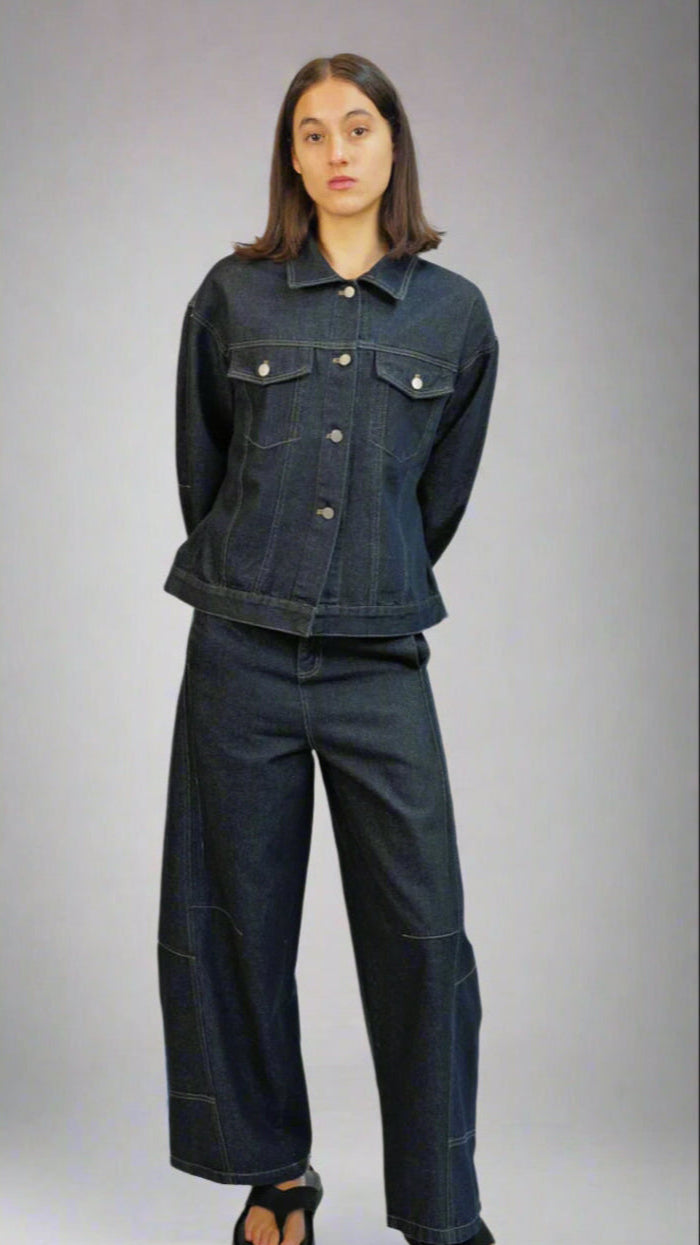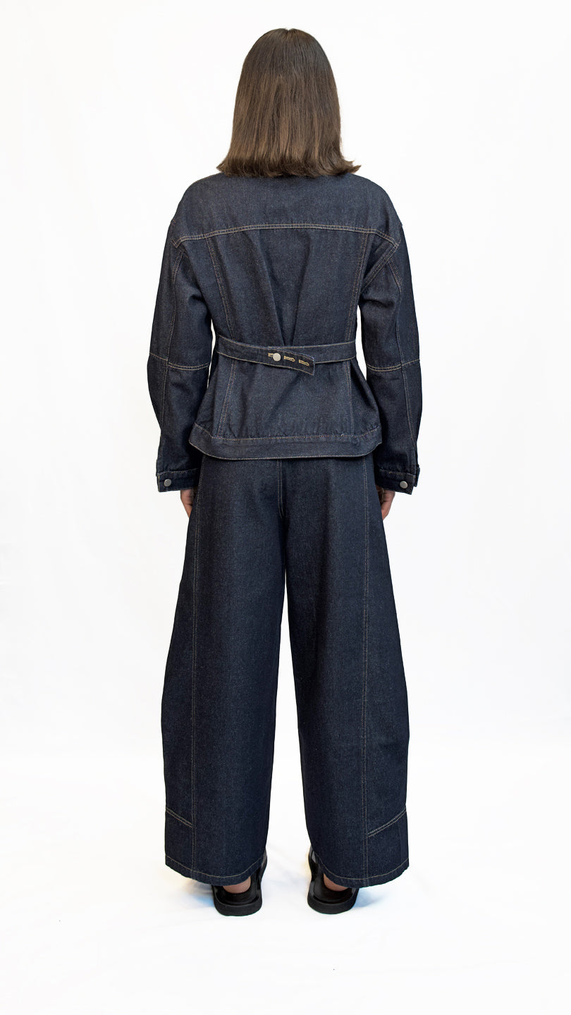 A structured fit denim jacket with button closure and an adjustable cinched detail at the back for a flattering shape. Casual, comfortable, and perfect for everyday wear.