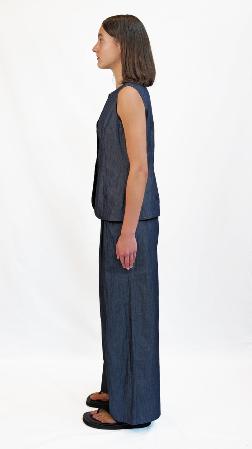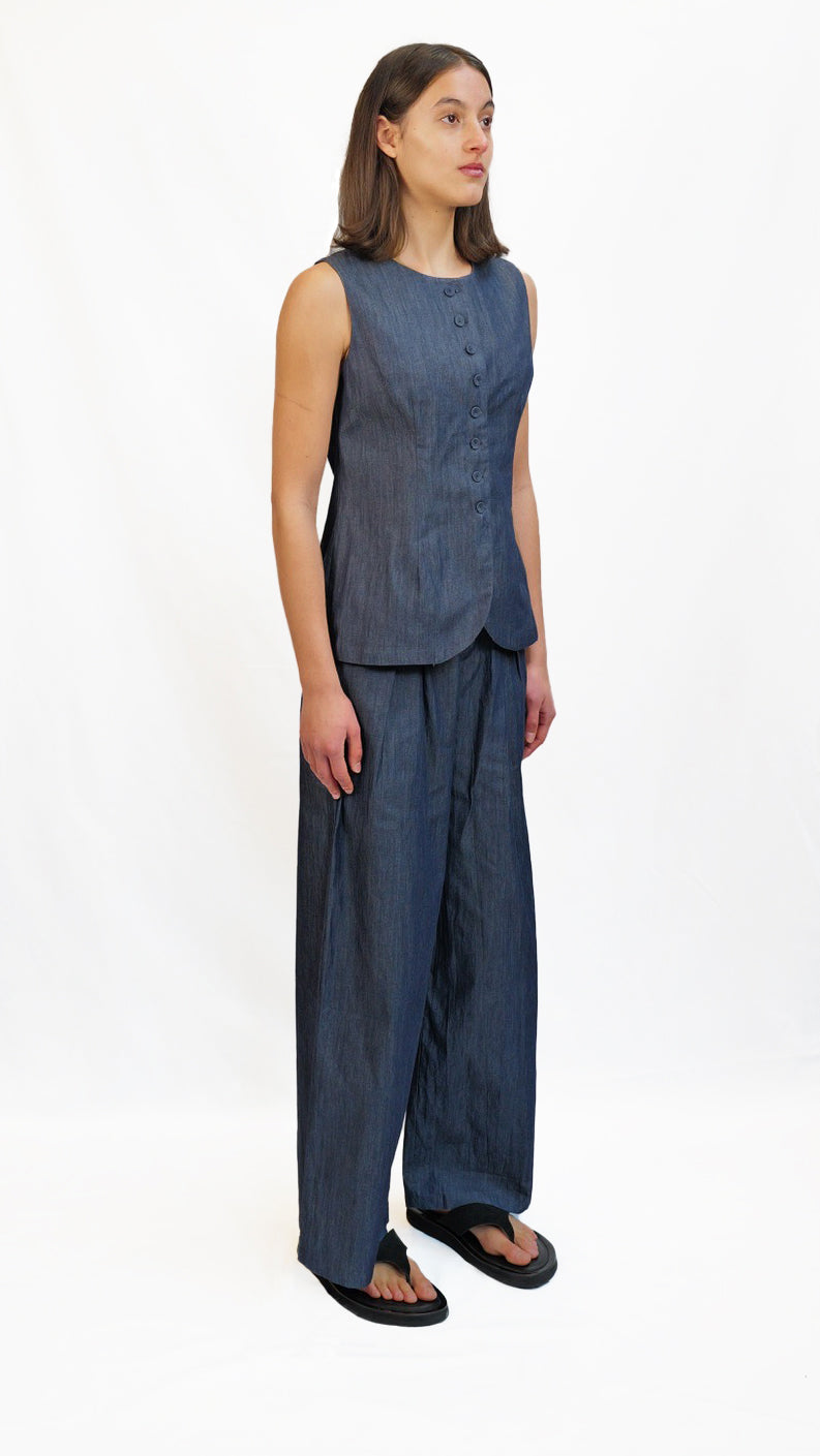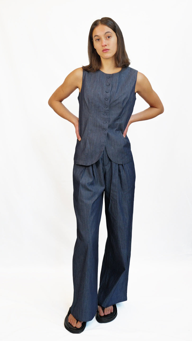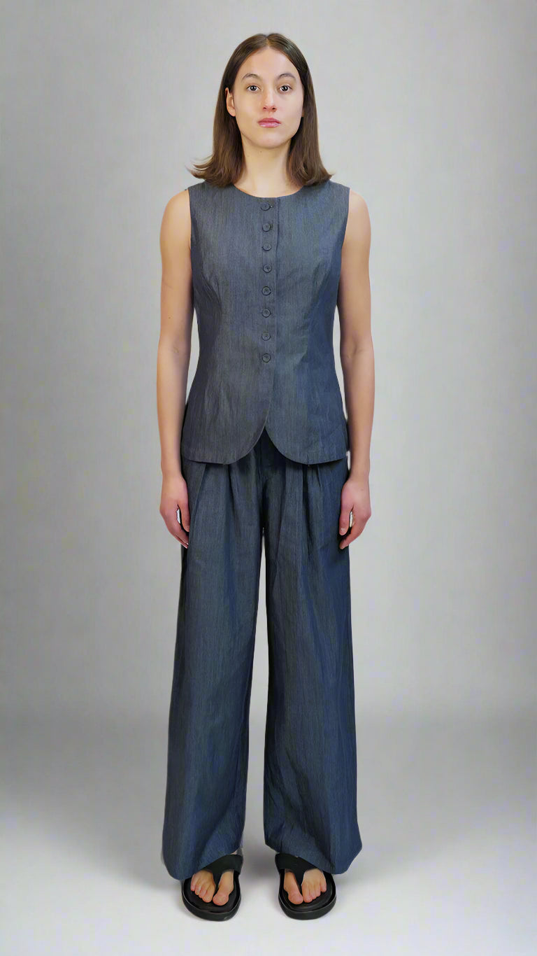 Crafted from soft cotton, the Zea Indigo Cotton Vest offers a refined sleeveless design with a sleek front button closure. Its minimalist style and breathable fabric make it an elegant layering piece for a polished, sophisticated look.