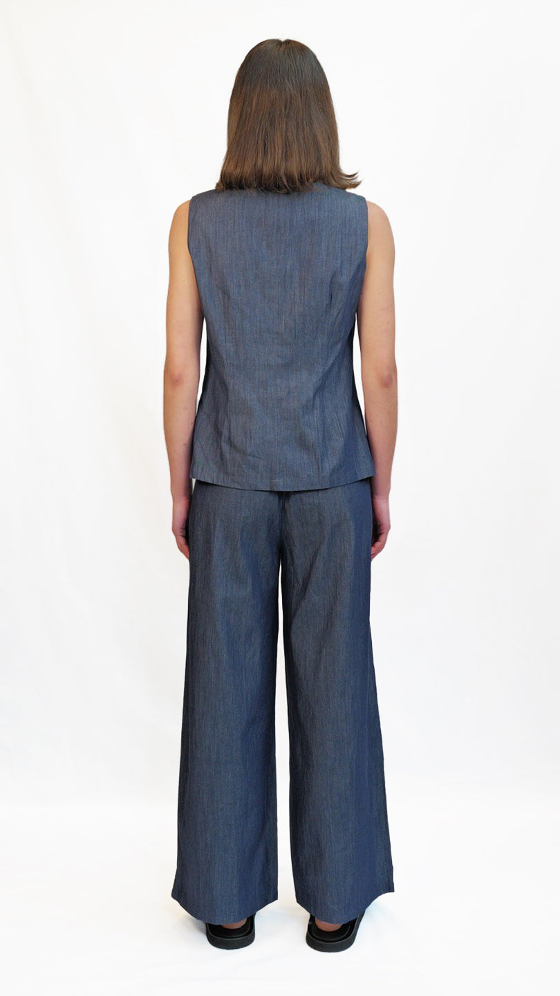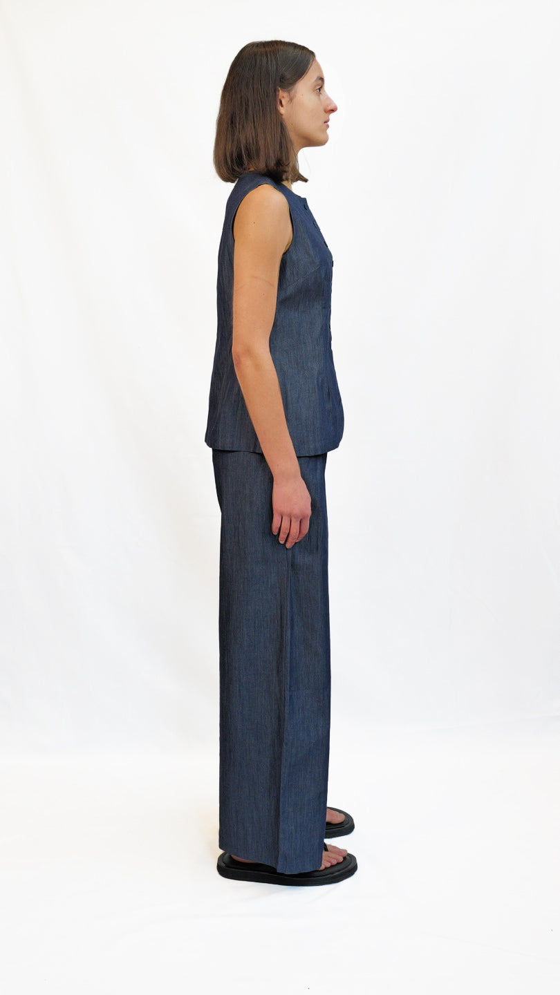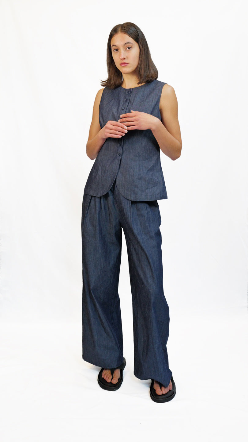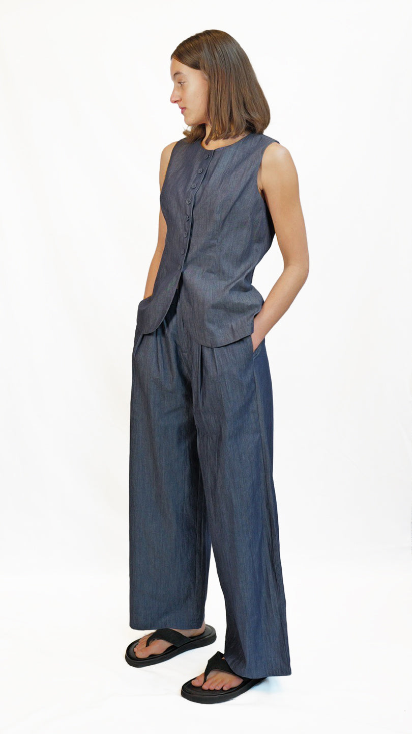 Crafted from soft cotton, the Zea Indigo Cotton Vest offers a refined sleeveless design with a sleek front button closure. Its minimalist style and breathable fabric make it an elegant layering piece for a polished, sophisticated look.